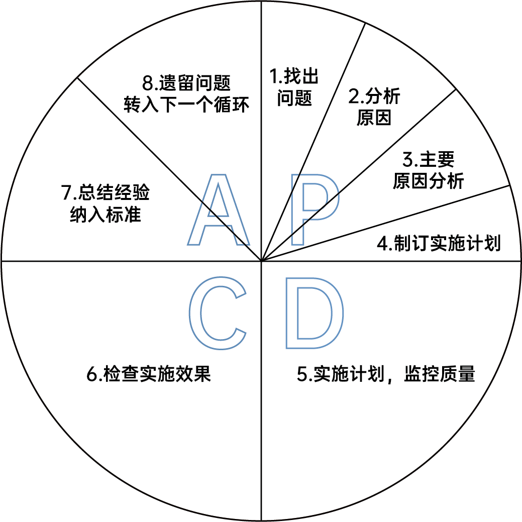 我们可以通过这种模式对项目和产品进行检查处理,对成功的经验加以肯定并适当地推广,将其标准化;对失败的教训加以总结,并将未解决的问题放到下一个PDCA循环里,如此循环,直到问题被成功解决。在具体的实施操作过程中,PDCA循环,又可以在计划、实施、检查和处理,四大模块中细分为下图中的八个步骤。