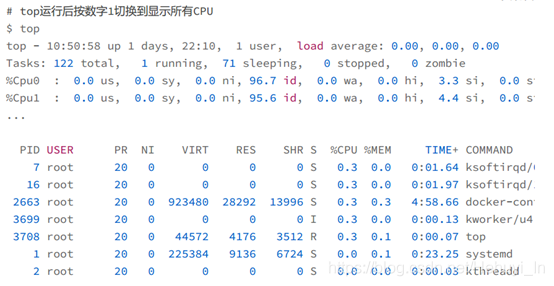 - 每个 CPU 的使用率都挺低,最高也只有 4.4%,并不算高。