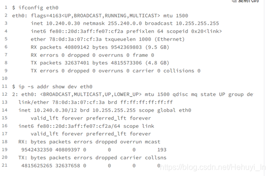 你可以看到,ifconfig 和 ip 命令输出的指标基本相同,只是显示格式略微不同。比如,它们都包括了网络接口的状态标志、MTU 大小、IP、子网、MAC 地址以及网络包收发的统计信息。