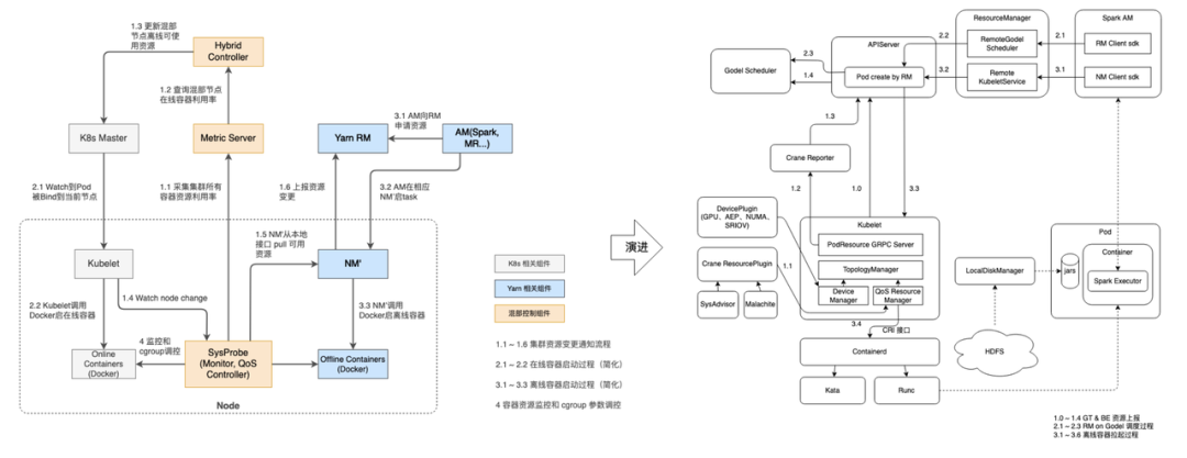 在新的统一调度架构下,我们的混合部署架构也做了一系列的调整。保留了平台层 Kubernetes 的 API 以及 Yarn 的 Resource manager 两个入口部署应用的能力。底层的系统上是全部收敛到了基于 Kubernetes 的管控系统上,可以实现大数据系统平稳的底层系统的切换工作。
