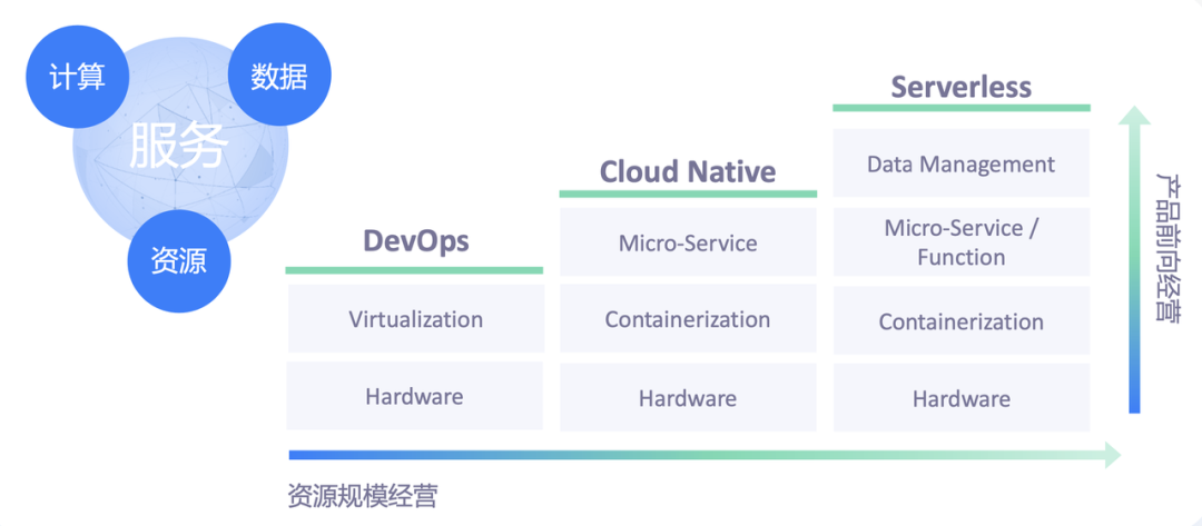 我们把和云原生相近的技术体系分成了 DevOps、Cloud Native 以及 Serverless 三代。