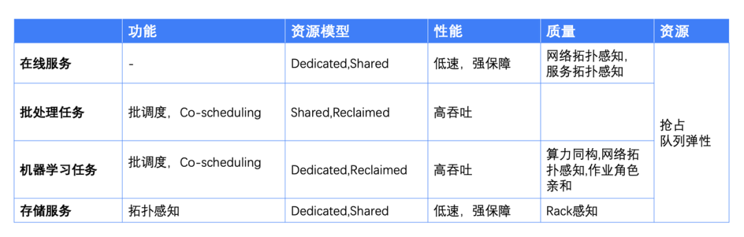 下图总结了调度功能层面下不同场景对于调度器的需求: