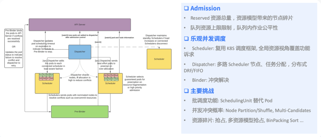其中,Dispatcher 主要负责把应用以及集群内部的节点资源分配到具体的 Scheduler 上。Scheduler 在主体结构和 Kubernetes 原生的调度器结构类似,主要处理的就是 predicate 和 priority 的调度计算逻辑。Binder 可以解决不同 Scheduler 视角下调度结果的冲突,并且用 SchedulingUnit 替换了原生的 Pod 语义。这样可以更加方便地处理常驻任务中 per Pod 调度以及批式场景下的 per batch 调度。