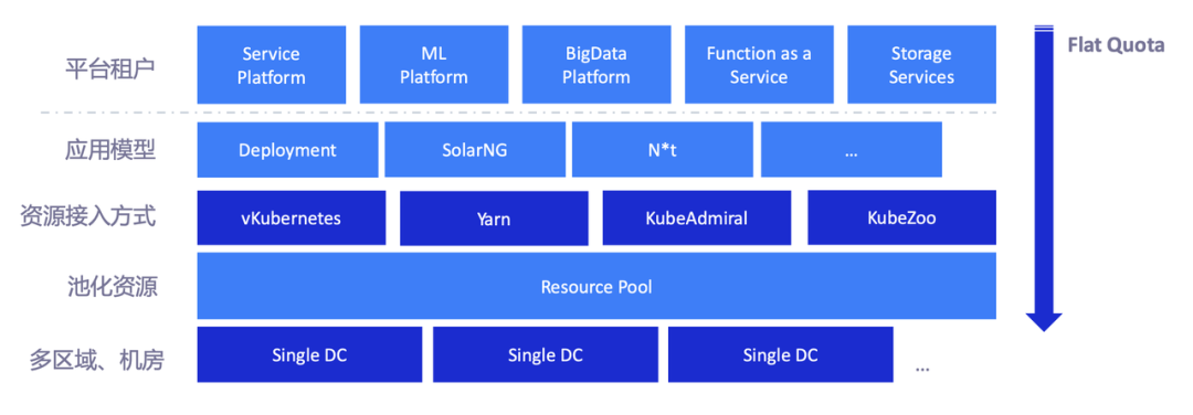 在资源管理方面,我们希望给用户呈现的是统一的资源池场 —— 一个充分并池混合的资源池。这个资源池具备全局最优的资源效率,能够统一管理多区域、多计算架构的资源。不同的业务形态和团队之间的资源就可以灵活调配。