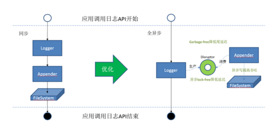 结合线程栈和磁盘IO分析,发现之前的日志框架(log4j/logback)都使用了同步模式。并发量大时锁竞争激烈,上下文切换造成额外开销;另外,同步模式下,磁盘较低的IOPS影响应用的响应时间。因此我们切换到了log4j2框架上来,并结合LMAX Disruptor,开启了全异步的日志模式,同时log4j2的对象复用机制减少了框架本身产生的内存垃圾,降低日志框架造成尾延迟的概率,将日志对应用的影响降到最低。