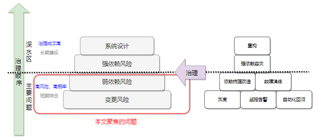 我们的目标很明确:减少线上问题。我们通过分析系统现状、回顾历史问题,将问题分为两类,一类是高风险高概率,需要重点突击解决的主要问题,包括变更风险、弱依赖风险。另一类是存在潜在风险,但治理成本高,需要长期投入建设的深水区问题,包括强依赖风险,系统设计。我们针对问题,制定了对应的治理措施。包括:灰度、监控告警、自动化回归、强弱依赖治理、演练、重构等。因篇幅有限,本文将聚焦于主要问题的治理措施。