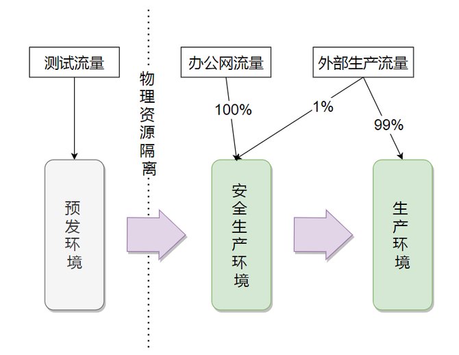 安全生产环境是由集团层面为保障线上稳定性的灰度流量生产环境。通过接入层网关的流量控制为环境提供1%线上流量+100%办公网流量,还原线上环境为系统验证提供场所。