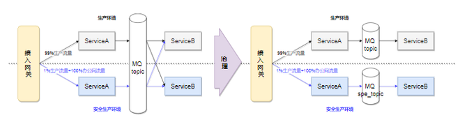 常规场景下,安全生产流量能保证从入口到后续全链路都在安全生产环境闭环。但在闲鱼消息场景里,强依赖MQ做流量的负载均衡,而安全生产流量经过MQ之后会被均匀打散,逃逸到线上,失去灰度观察能力。针对该问题,我们通过spring的Conditional条件注入能力,将线上和安全生产的MQ bean隔离,从而将线上和安全生产MQ topic隔离,使流量能够在安全生产环境完整闭环。