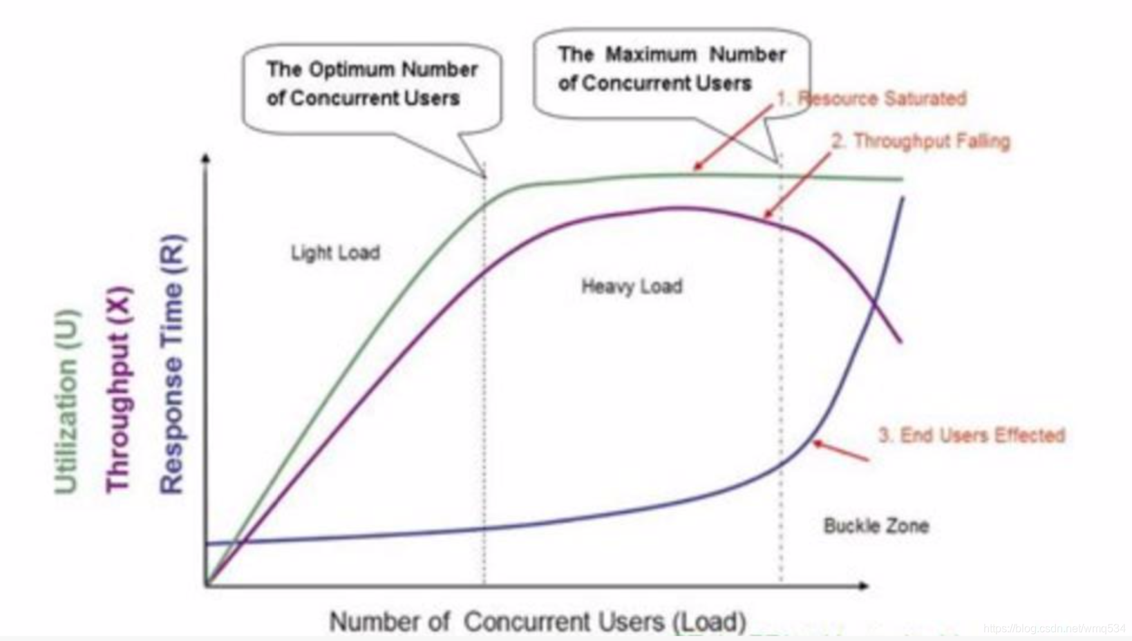 响应时间和并发数据在左边线位置达到优化目标,之后利用率60%提升非常缓慢,当超过右侧线是,系统性能急剧下降。
