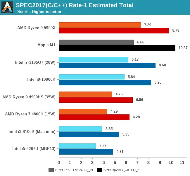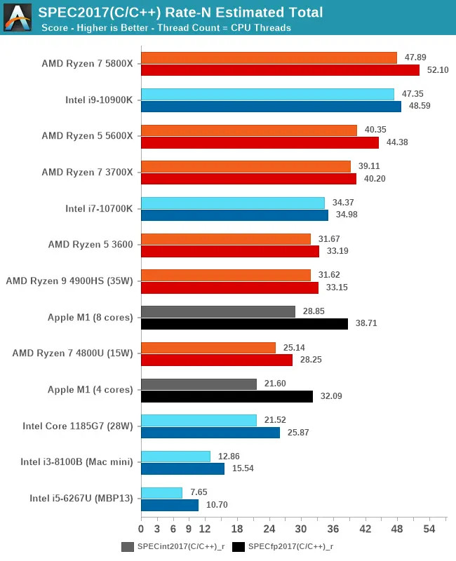 SPECint2017中,结果与2006有点类似,但弱于Zen 3的5950X。但是在多核比试中,M1完全落败于 AMD Ryzen 7 5800X,10代i9,10代i7以及Ryzen 5600x/3700x/3600/4900HS等。