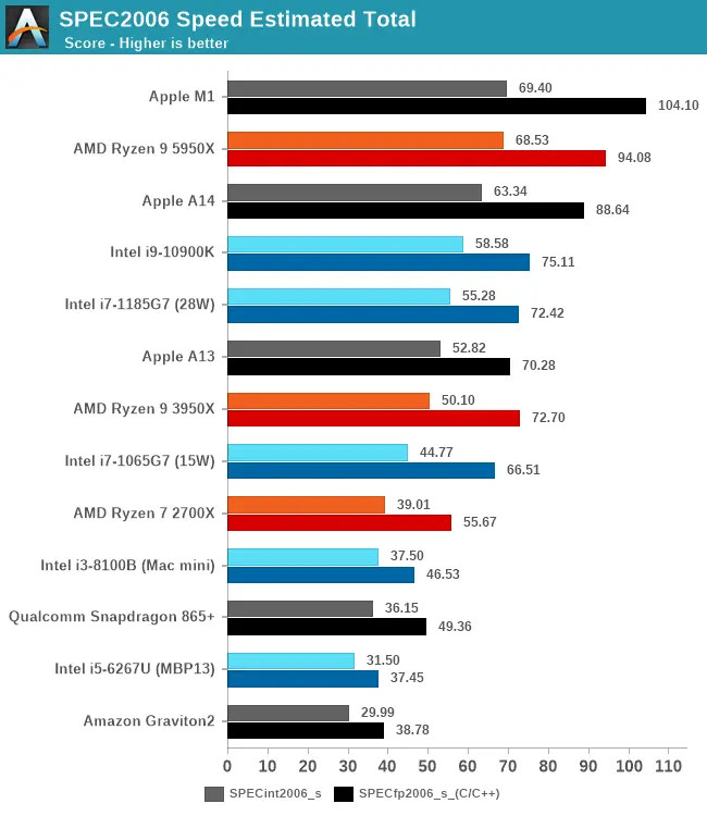 SPEC2006总体得分中,M1稍领先于Ryzen 9 5950X。