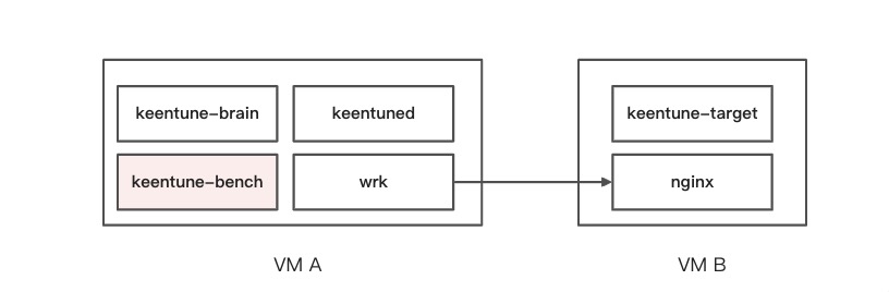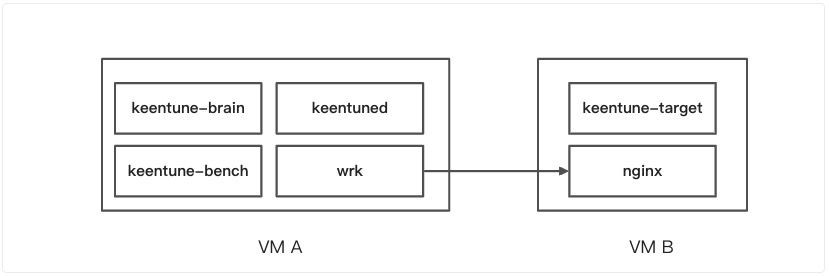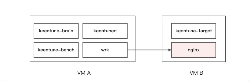 准备两台虚拟机,VM A安装wrk,keentuned,keentune-brain,keentune-bench,作为测试机;VM B安装Nginx,作为Nginx服务端,同时安装KeenTune-target,为待测机器。