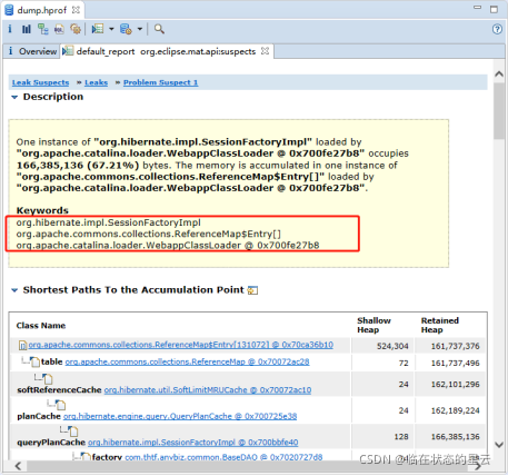 问题现象: 一个后台服务在运行一段时间后,观察内存一直在增加,使用MAT工具,打开堆文件分析内存泄漏情况:fileName_Leak_Suspects的index 发现如下提示: One instance of "org.hibernate.internal.SessionFactoryImpl"