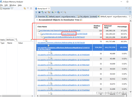 MAT中已经给出有可能出问题的代码位置。SessionFactoryImpl中的QueryPlanCache的体积特别庞大占比达到67%。