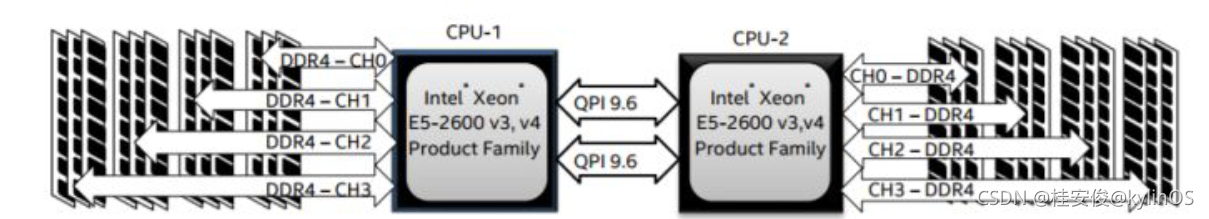 回到当前世面上的CPU,工程上的实现其实更加复杂了。以来看,两个Socket之之间通过各自的一条9.6GT/s的QPI link互访。而每个Socket事实上有2个内存控制器。双通道的缘故,每个控制器又有两个内存通道(channel),每个通道最多支持3根内存条(DIMM)。理论上最大单socket支持76.8GB/s的内存带宽,而两个QPI link,每个QPI link有9.6GT/s的速率(~57.6GB/s)事实上QPI link已经出现瓶颈了。