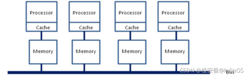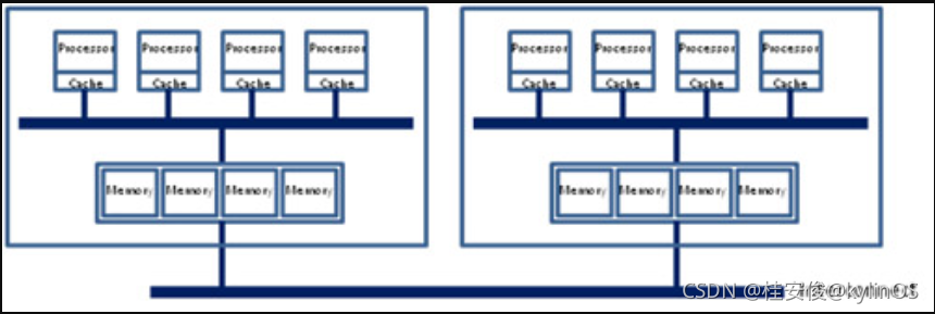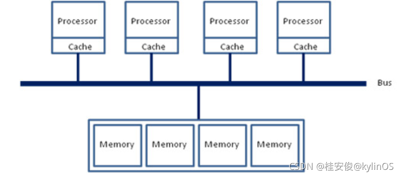 SMP (Symmetric Multi Processing),对称多处理系统内有许多紧耦合多处理器,在这样的系统中,所有的CPU共享全部资源,如总线,内存和I/O系统等,操作系统或管理数据库的复本只有一个,这种系统有一个最大的特点就是共享所有资源。多个CPU之间没有区别,平等地访问内存、外设、一个操作系统。操作系统管理着一个队列,每个处理器依次处理队列中的进程。如果两个处理器同时请求访问一个资源(例如同一段内存地址),由硬件、软件的锁机制去解决资源争用问题。Access to RAM is serialized; this and cache coherency issues causes performance to lag slightly behind the number of additional processors in the system.