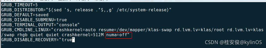 # vim /etc/default/grub //如下图所示加上:numa=off