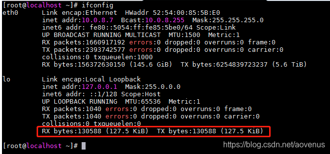 (2)使用watch more /proc/net/dev查看网卡流量,默认是以字节显示