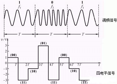如果在数字传输过程中,0V、2V、4V和6V分别表示00、01、10和11,那么每个码元有四种状态00、01、10和11。每个码元代表两个二进制数字。此时的每秒码元数是每秒二进制代码数是一半的,这叫四相调制,波特率等于比特率一半。