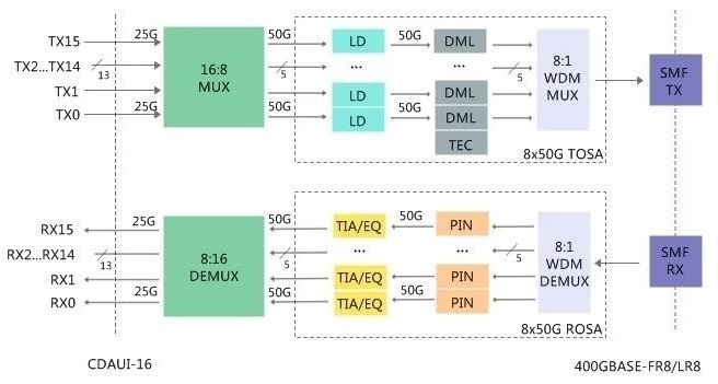 IEEE802.3工作组对400G 光模块的命名规则进行了定义,例如400G SR4.2的名称中,400G代表速率是400Gbps,S代表数据中心内部机柜之间互连,距离一般在150米以内,4代表光纤对数,也就是8芯光纤,2代表每芯光纤上有2个波长。