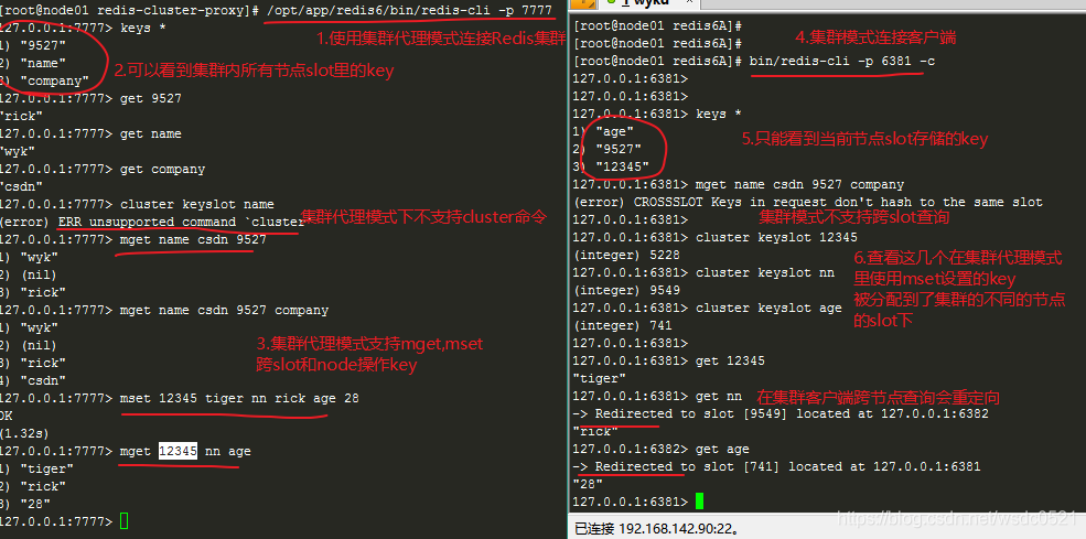 在集群代理模式下,可以跨slot甚至跨节点操作key,而在集群模式下链接客户端是做不到的。下图演示了如果在集群代理中使用mset和mget跨slot跨node设置或查询key,对于用户来说仿佛是在使用一个单实例的Redis: