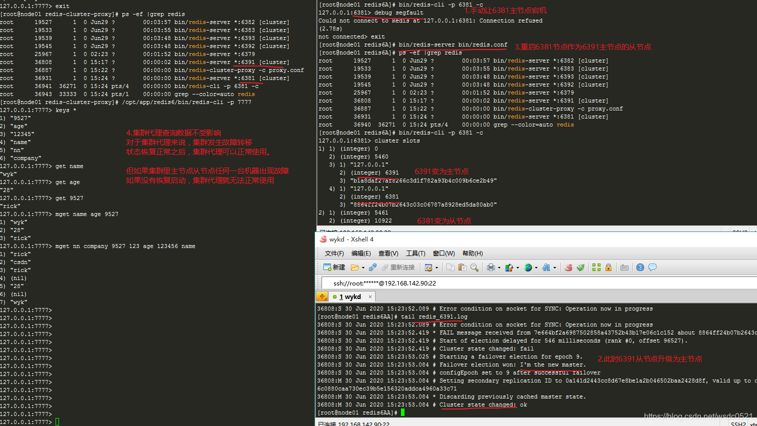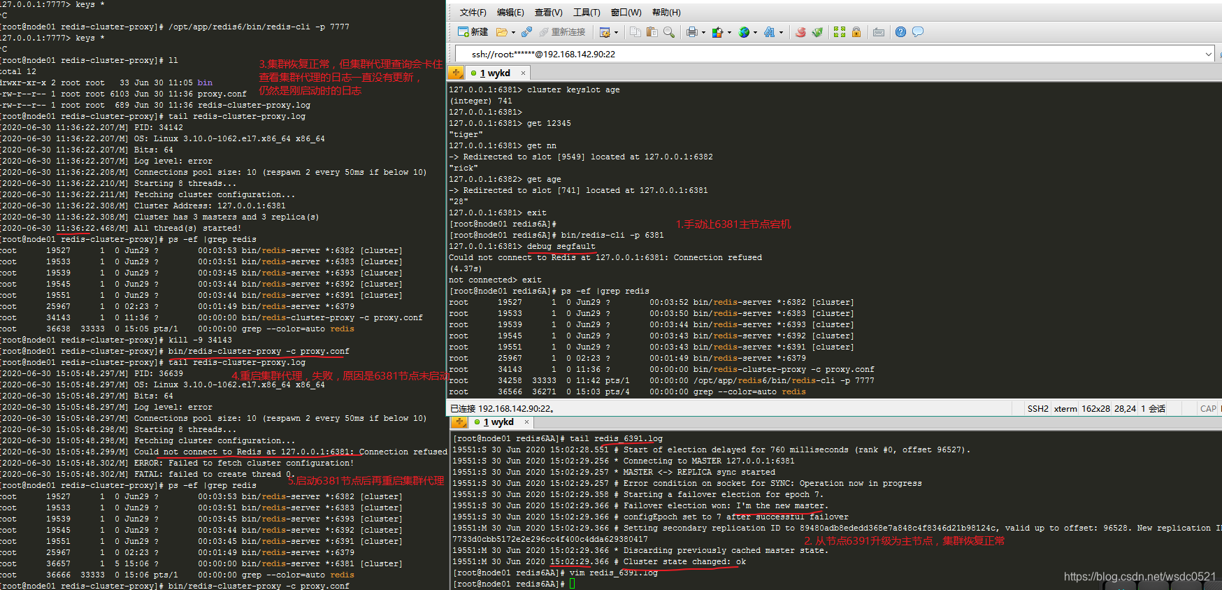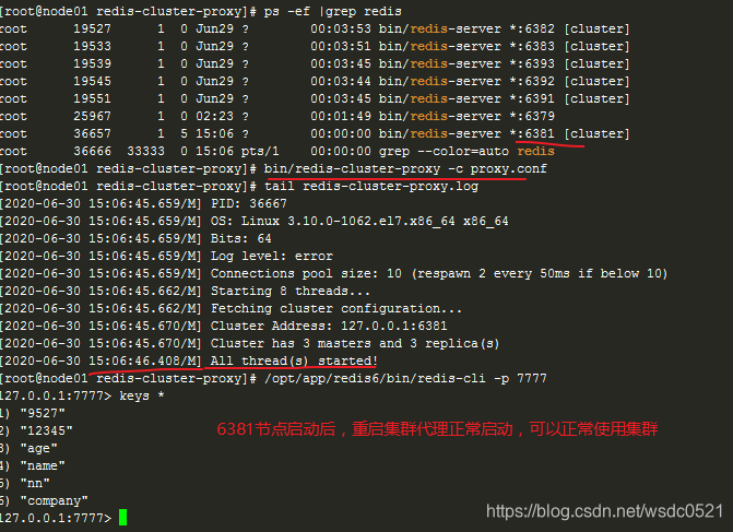情况一、主节点6381宕机,6391节点升级为主节点,集群恢复正常,但6381节点还没启动,此时集群代理无法使用,需要启动6381节点之后集群代理才能恢复使用: