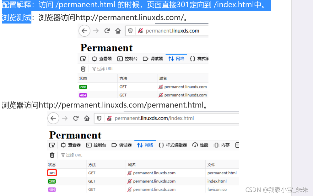 - 配置解释:访问 /permanent.html 的时候,页面直接301定向到 /index.html中。