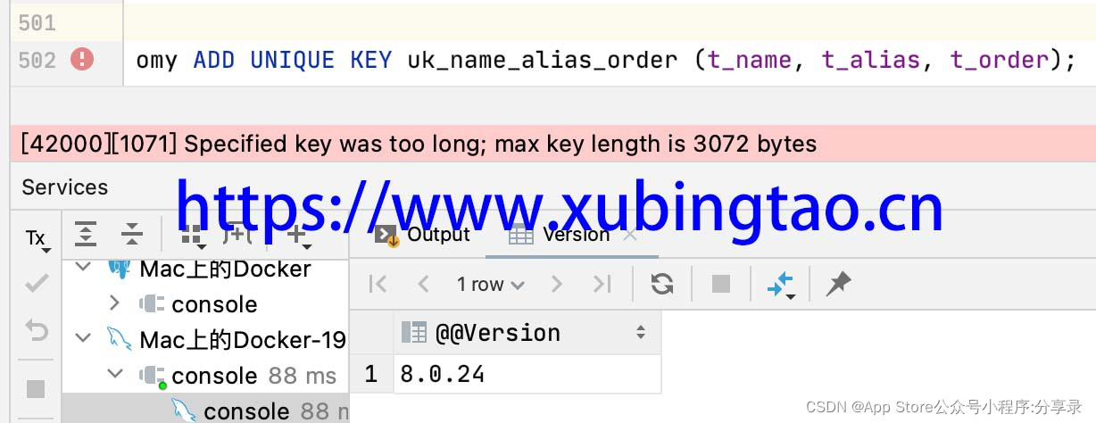 接着说下解决方案,InnoDB引擎默认索引长度最大只能是3072 bytes,对此我想到这两个方案:1.调整索引字段,包括修改字段长度、更换字段;2.使用前缀索引。其中修改字段长度可能会报“[22001][1406] Data truncation: Data too long for column 'xxx' at row N”错。