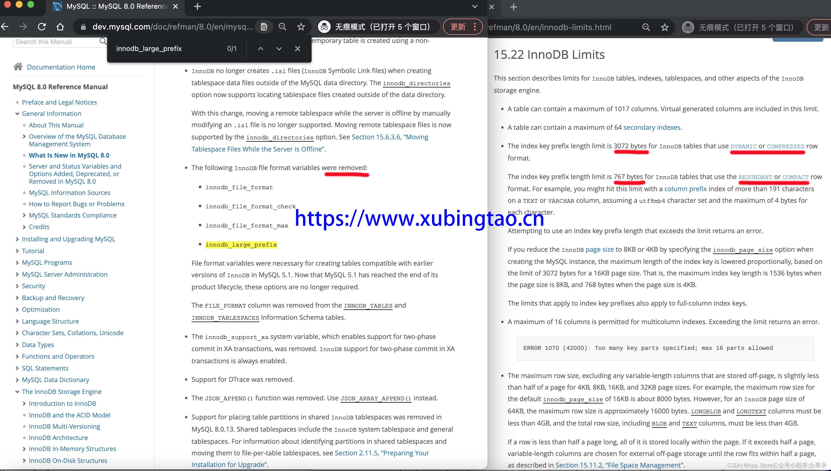 到MySQL 5.7默认innodb_large_prefix=ON,到MySQL 8.0以后直接remove了innodb_large_prefix、innodb_file_format等变量,row format为DYNAMIC或COMPRESSED让索引长度达到3072 bytes,REDUNDANT和COMPACT只有767 bytes,MySQL 8.0默认innodb_default_row_format=DYNAMIC,所以高版本不用动,前提一定要是InnoDB引擎,MyISAM引擎默认是1000 bytes,NDB则不支持。