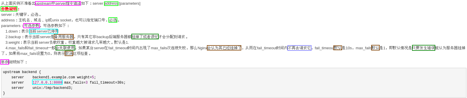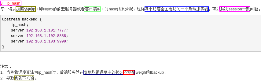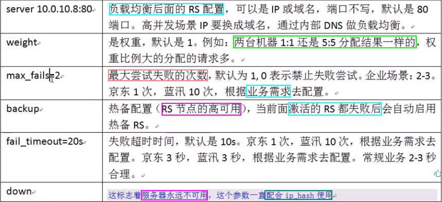 - 5)backup: 其它所有的'非backup机器down或者忙'的时候,才请求backup机器,所以这台机器'压力会最轻',可以理解为'备用'服务器