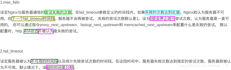 - 3)max_fails :允许请求失败的次数默认为1.当'超过最大次数'时,返回proxy_next_upstream 模块'定义的错误'