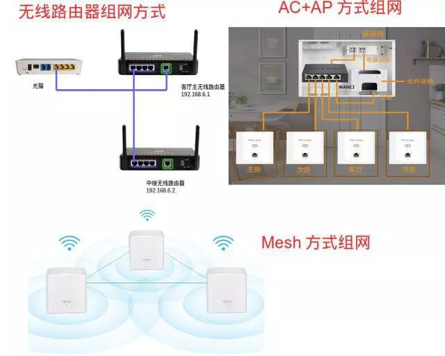 mesh路由器组网:mesh路由器组网是一种无线方式,多个mesh路由器自组织、自配置,形成一个全连接的网格网络,相比无线中继方式组网网络稳定性要高很多。