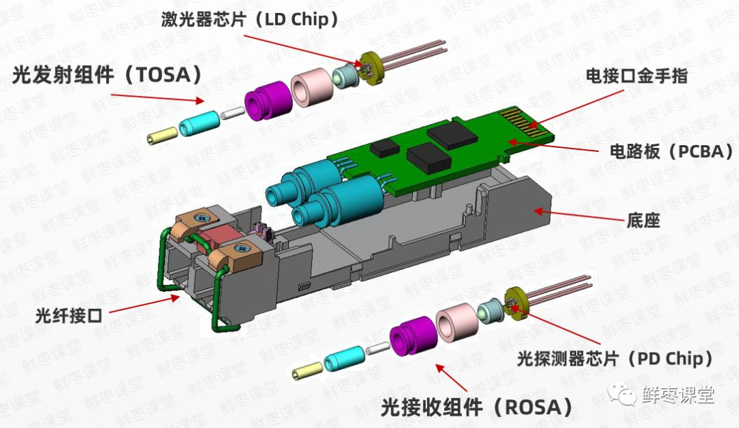 一个光模块,通常由光发射器件(TOSA,含激光器)、光接收器件(ROSA,含光探测器)、功能电路和光(电)接口等部分组成。