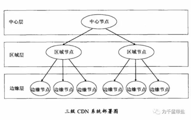 这张图只反映了源站与加速节点之间的关系,然而一个有效的CDN系统想要高效的运转,还需区域节点和中心节点的参与。所以经典的CDN三层架构,如下图: