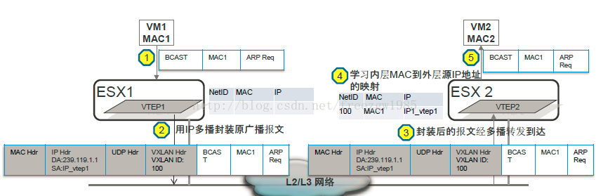(VTEP)的IP地址。在多播情况下引入VXLAN管理层,利用VNI和IP多播组的映射来确定VTEPs。???
