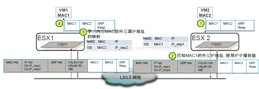 2)VTEP2接收到VM2的响应报文后把它封装在ip单播报文中(VXLAN标识依然为100),然 后向VM1发送单播