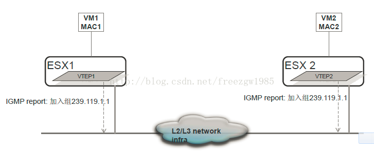 VM1和VM2连接到VXLAN网络(VNI)100,两个VXLAN主机加入IP多播组239.119.1.1