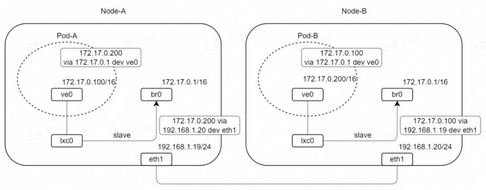 Node-A/B 中分别创建桥接口 br0,网段为 172.17.0.0/16,通过 lxc0(veth 设备)与 Pod-A/B 连通。