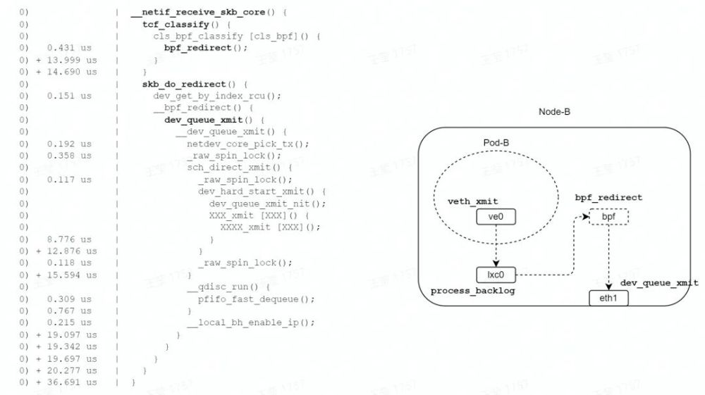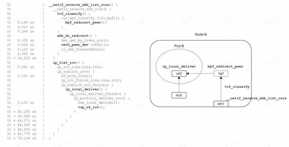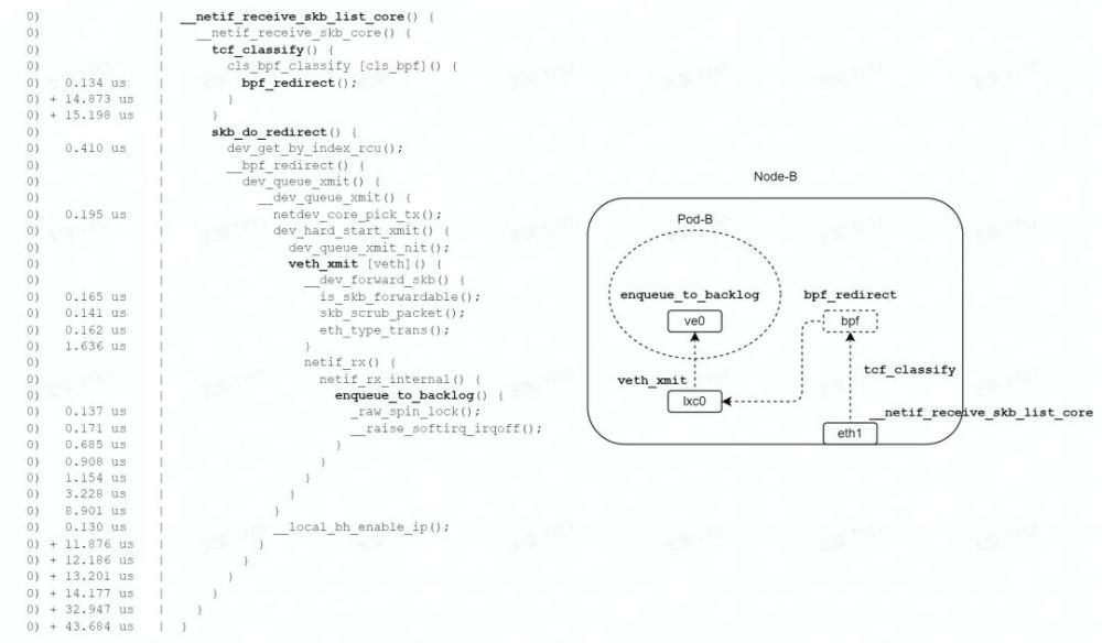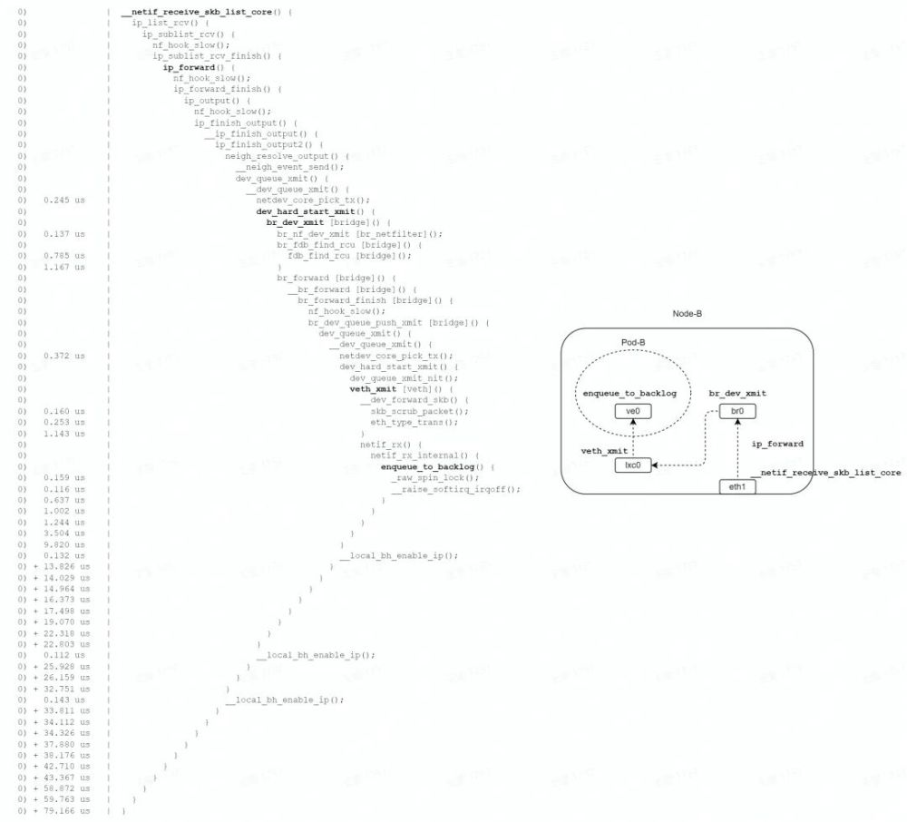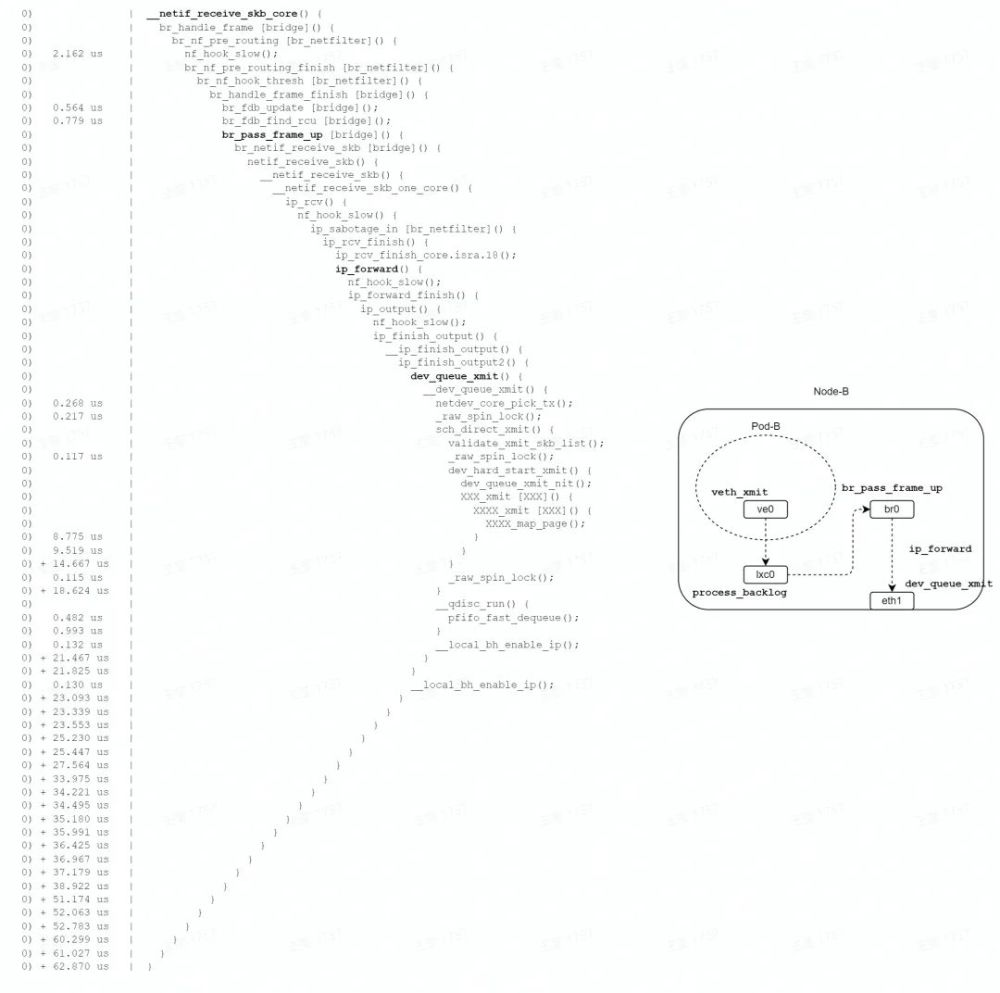 由上面的操作可以看到,我们直接跳过了 bridge 的转发,利用 eBPF 程序,将 eth1 与 lxc0 之间建立了一个快速转发通路。下面我们用 perf ftrace 看一下加速效果。