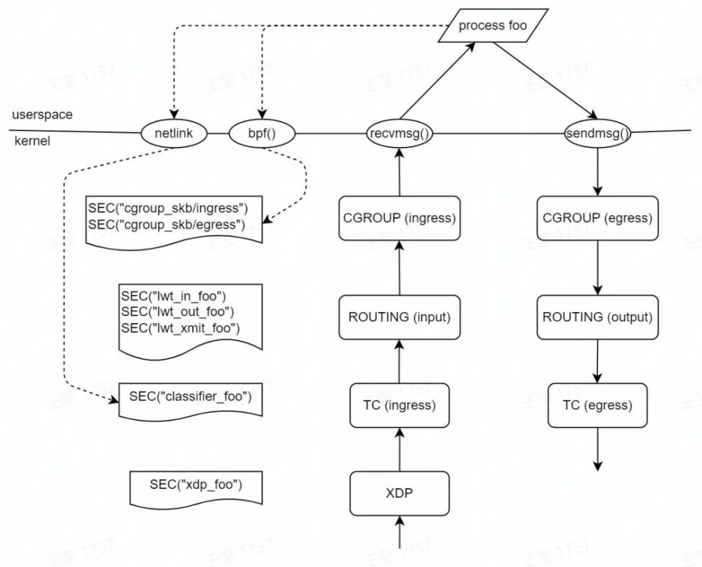 首先,我们先看一下内核协议栈主要支持的 eBPF hook 点,在这些 hook 点我们可以注入 eBPF 程序,实现具体的业务需求。