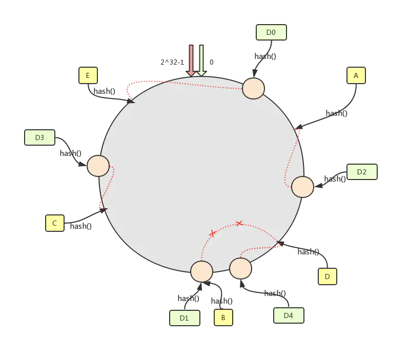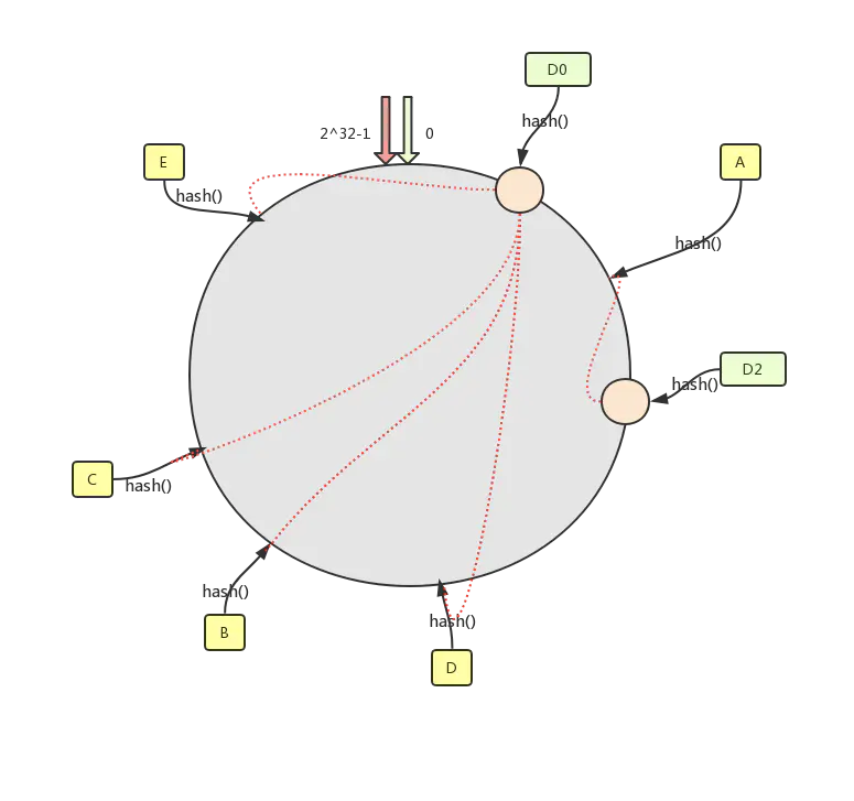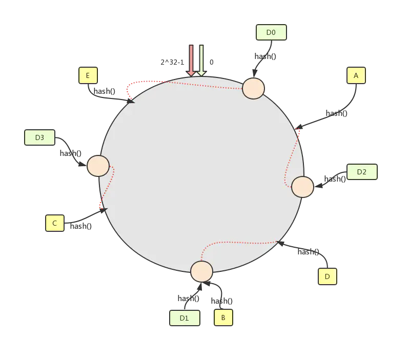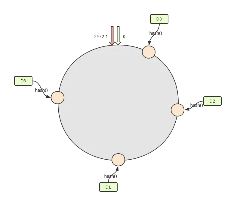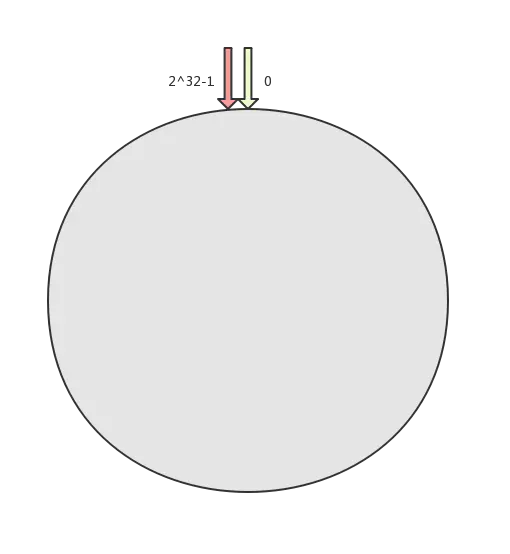 一致性 Hash 算法也是使用取模的思想,只是,刚才描述的取模法是对节点数量进行取模,而一致性Hash算法是对 2^32 取模,什么意思呢?简单来说,一致性Hash算法将整个哈希值空间组织成一个虚拟的圆环,如假设某哈希函数H的值空间为0-2^32-1(即哈希值是一个32位无符号整形),整个哈希环如下,从 0 ~ 2^32-1 代表的分别是一个个的节点,这个环也叫哈希环