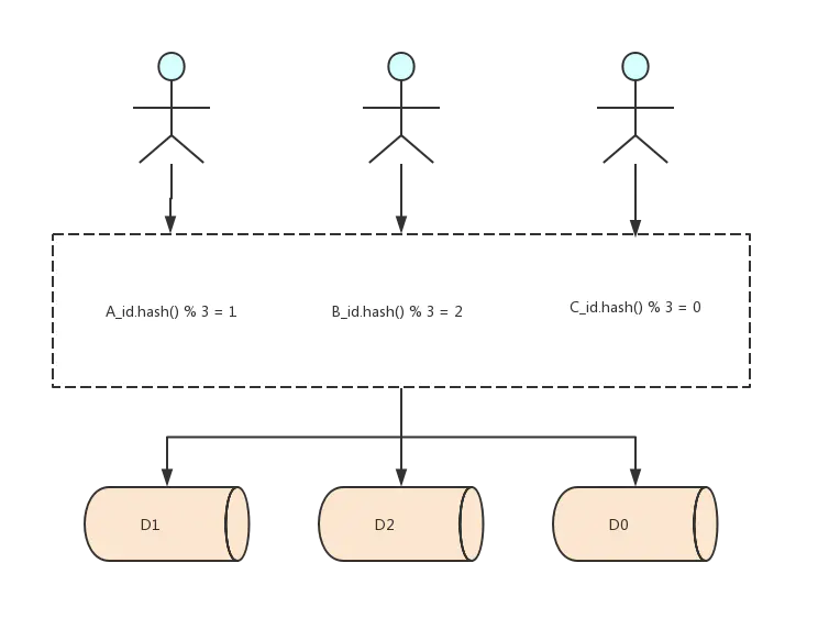 分库分表的时候,用户 A 的记录落在了 D1 机器,用户 B 的记录落在了 D2 机器,用户 C 的机器落在了 D0 机器上,用户 A 要存在哪条数据库上的计算过程是用户 A 的会员 id 的哈希值对 3 取模,因为现在只有 3 台机器,伪代码: A_id.hash() % / 3,用户 B 和用户 C 依次类推。如下图所示