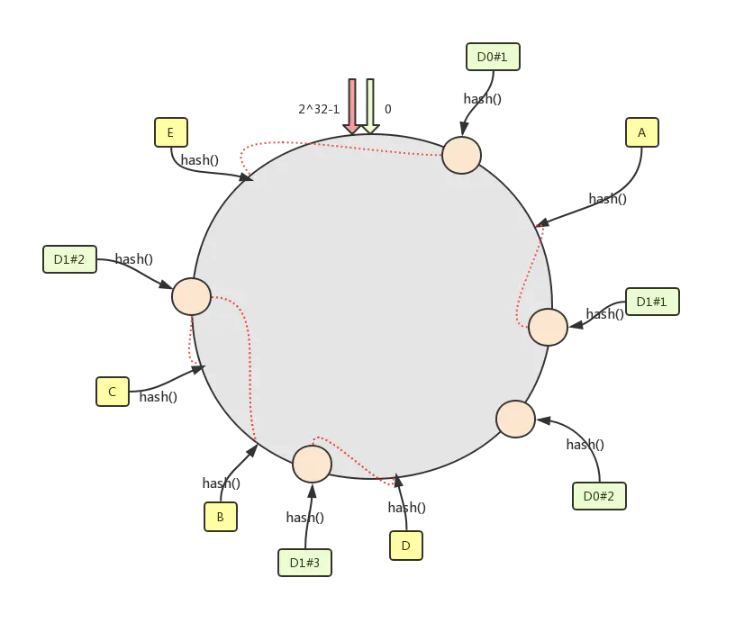 为了避免出现数据倾斜问题,一致性 Hash 算法引入了虚拟节点的机制,也就是每个机器节点会进行多次哈希,最终每个机器节点在哈希环上会有多个虚拟节点存在,使用这种方式来大大削弱甚至避免数据倾斜问题。同时数据定位算法不变,只是多了一步虚拟节点到实际节点的映射,例如定位到“D1#1”、“D1#2”、“D1#3”三个虚拟节点的数据均定位到 D1 上。这样就解决了服务节点少时数据倾斜的问题。在实际应用中,通常将虚拟节点数设置为32甚至更大,因此即使很少的服务节点也能做到相对均匀的数据分布。这也是 Dubbo 负载均衡中有一种一致性哈希负载均衡的实现思想。