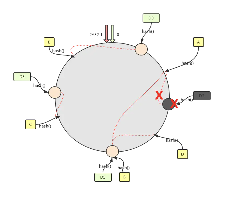 我们假设上图中的 节点 D2 因为一些原因宕机了,可以看到,只有数据 A 的记录需要重新重新定位存储到节点 D1 上,因为 D1 是 D2 的下一个节点,其它的数据都没有被影响到,此时被影响的仅仅是 图中的 D0-D2 这段区间的记录,也就是之前落在 D2 上的数据现在都要落到 D1 上面了。如下图